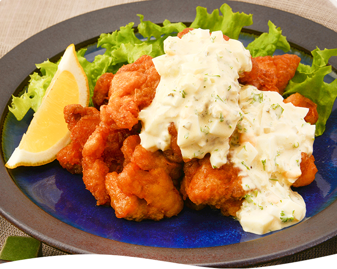 卵と薄力粉で作った衣に鶏もも肉をくぐらせ、170℃に温めた油で約3分揚げる。