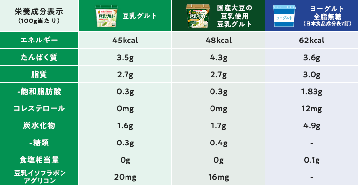 豆乳グルトは乳のヨーグルトと比較すると炭水化物が低く、コレステロールが0、大豆イソフラボンも摂取できます。豆乳グルトの原料である豆乳は大豆からできており、大豆は植物性たんぱく質が豊富で、脂質、炭水化物もバランスよく含まれています。