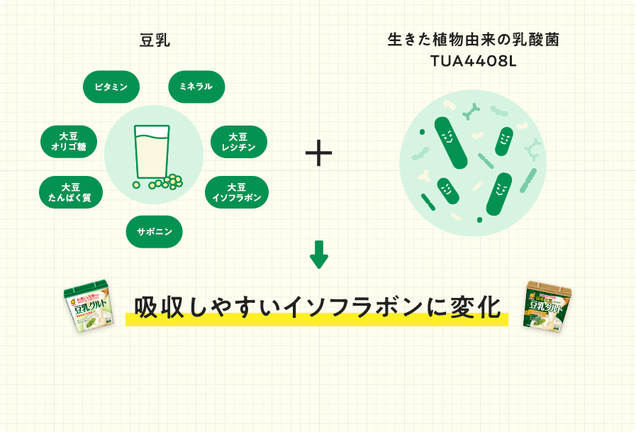 豆乳グルトのメリットは豆乳と乳酸菌をWで摂取できるだけではありません。植物由来の乳酸菌のチカラで豆乳の特長成分である大豆イソフラボンが吸収されやすい形(アグリコン型イソフラボン)に変化します。