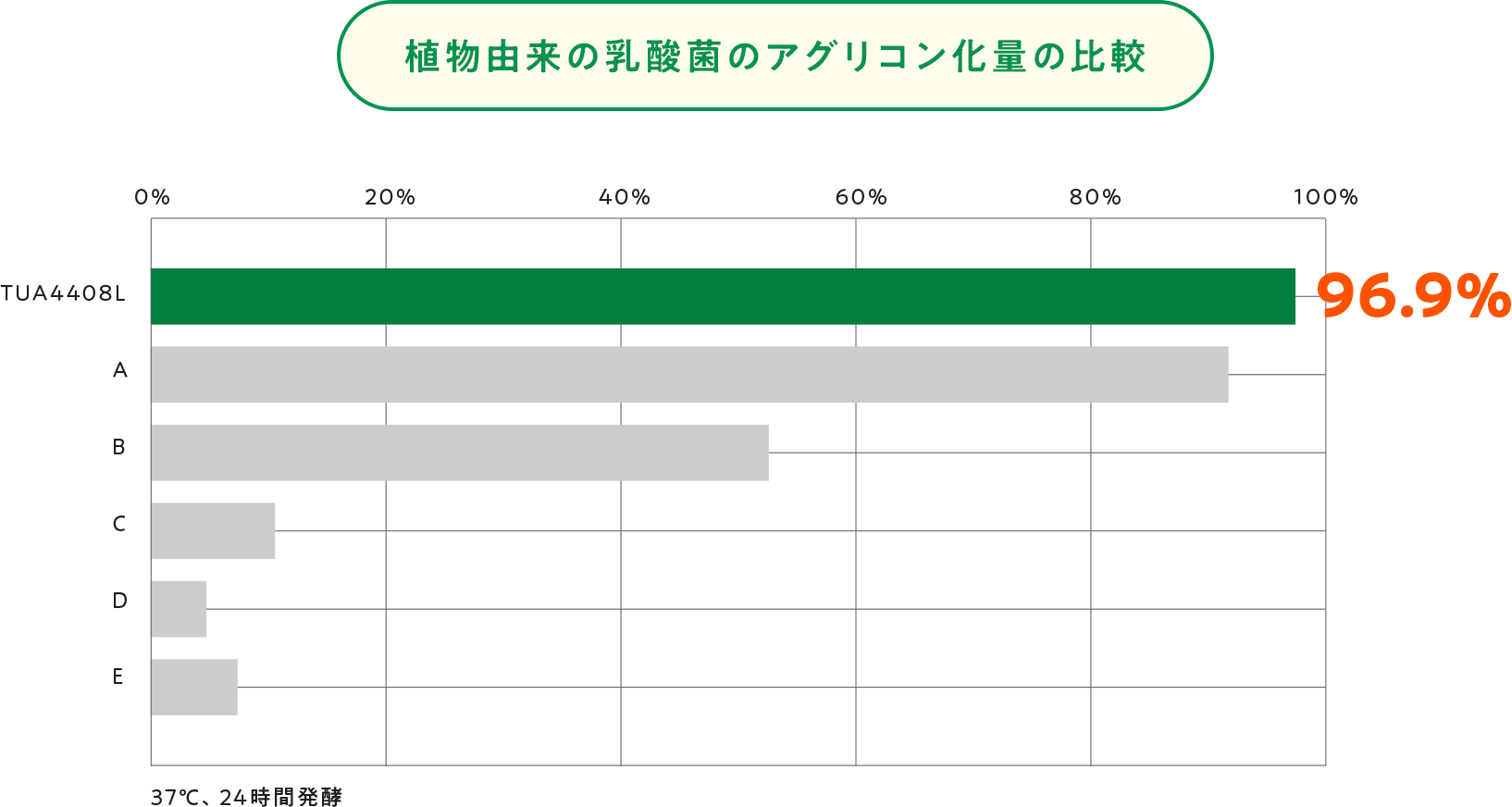 豆乳グルトには配糖体型イソフラボンを吸収しやすいアグリコン型イソフラボンに変換する能力があり、なおかつ豆乳をおいしく発酵させることができる植物由来の乳酸菌TUA4408Lを東京農業大学との共同研究によって選抜し、使用しています。アグリコン型イソフラボンへの変換能力と、豆乳との相性の良さが選んだ決め手ではありますが、TUA4408Lは新たな可能性を秘めており、今後も研究を続けていきます。