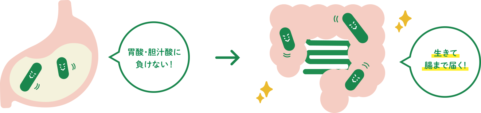 乳酸菌が順調に生育するためにはエネルギー源となる糖分の他、アミノ酸、ビタミン、ミネラルなどが欠かせません。それらは植物細胞の中に包み込まれていますが、植物細胞には苦み成分や辛み成分(ポリフェノール類など)が含まれており、細胞が壊れるとそれらも同時に出てきます。植物由来の乳酸菌はこれらの成分の中で生き抜き、発酵しなければなりません。このような環境に育った植物由来の乳酸菌は苛酷な環境に耐えて生きる力があり、ヒトの消化管に入っても胃酸や胆汁酸などの強い消化液の中を耐えて生き抜き腸にまで到達することができるのです。多くの植物由来の乳酸菌は生きて腸にまでたどり着くので、腸内環境の改善に役立つ優れものと言えます。