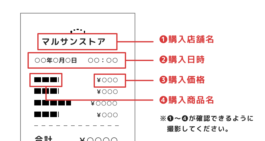 3)「購入店名/購入日時/対象商品名/対象商品金額」がわかるレシートであること