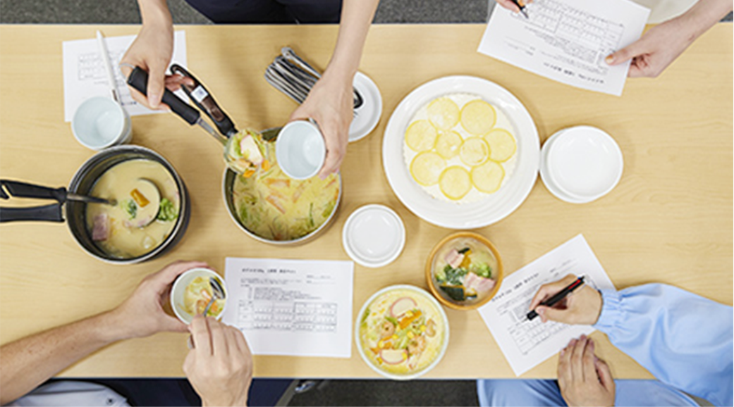 商品設計ができたら次は生産ラインに乗せられる設計図をひきます。いかにおいしさを実現するか、安全に生産できるか、環境に配慮できるかなど、様々なハードルを越えて製品へと仕上げていきます。中でも“おいしさ”の実現はとても難しく、味だけでなく香りや色、食感、喉ごしなどが複合的に関与しているため、常日頃から試食をし、自分で実際に作ってみることでおいしさの表現力を磨きます。また、海外向け製品はその国の食文化や好みにも配慮するなど、何が求められているかをきちんと把握したうえで設計しています。