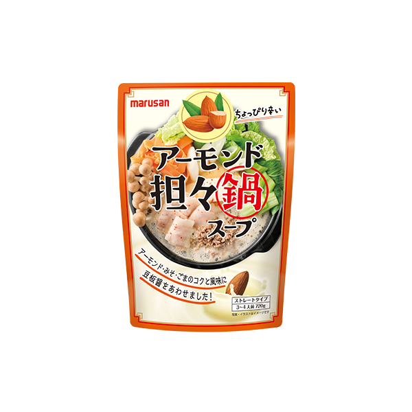 香り高いアーモンドベースにチキンのうまみを合わせ、2種類のごまのコクを効かせた担々鍋スープです。マルサンアイ伝統のこうじみそに、豆板醤を加え、コク深くまろやかな辛味が食欲をそそる味わいです。〆はラーメンがおすすめです。