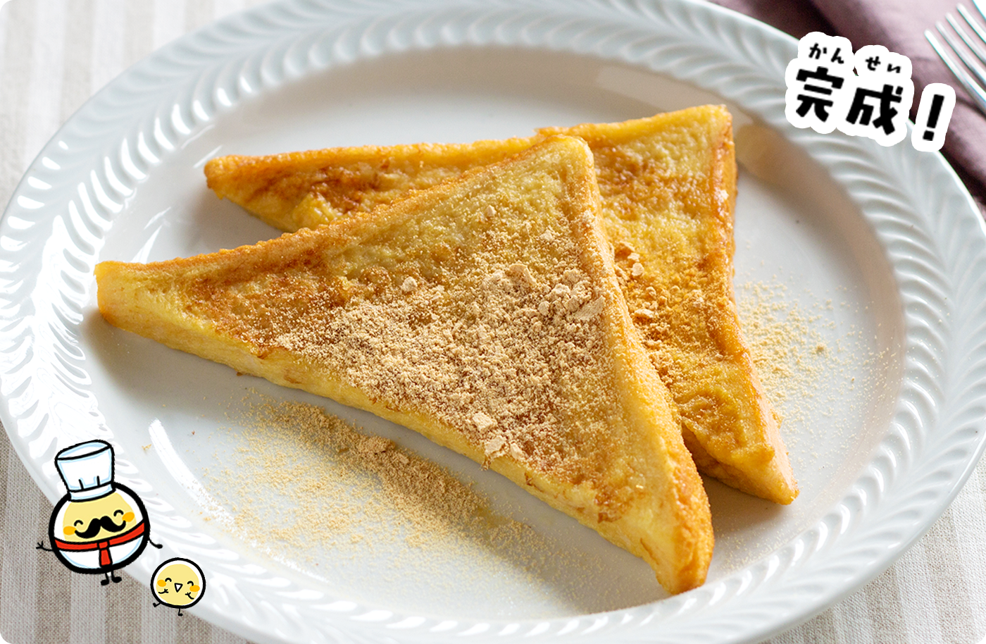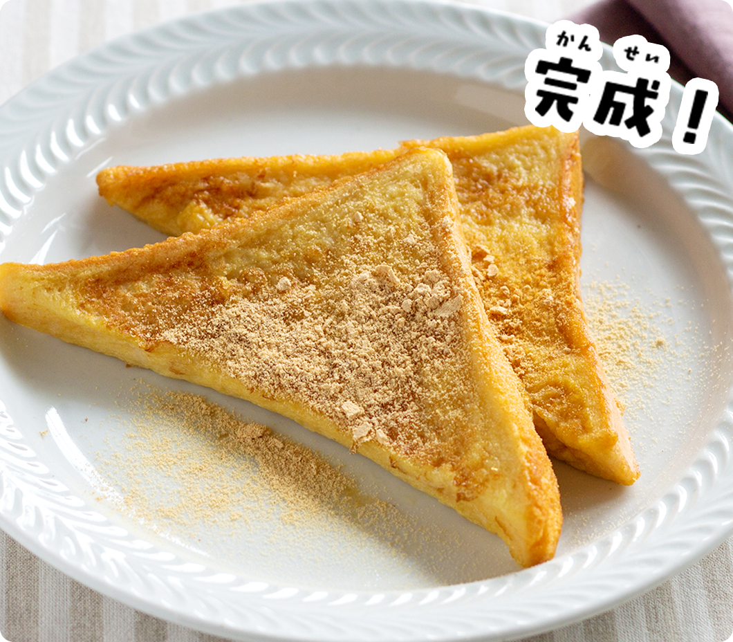 返 して裏 面 もよく焼 いたら、お好 みできな粉 をかけて、できあがり☆