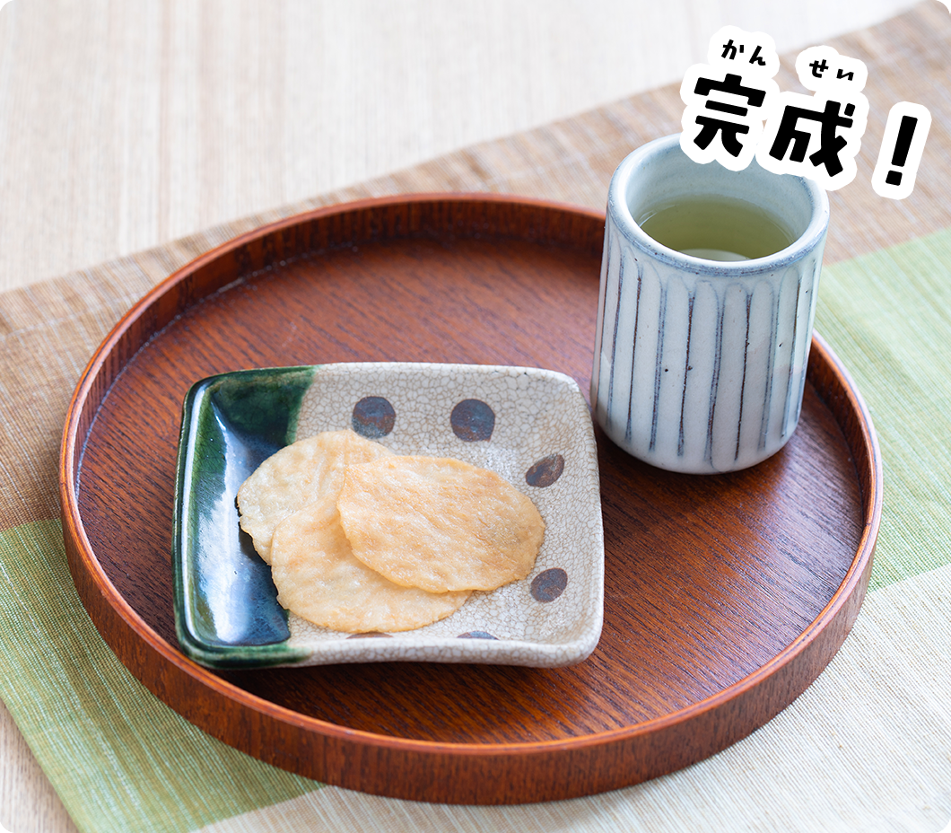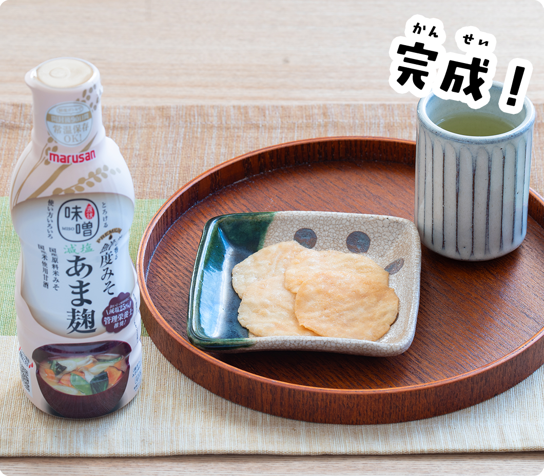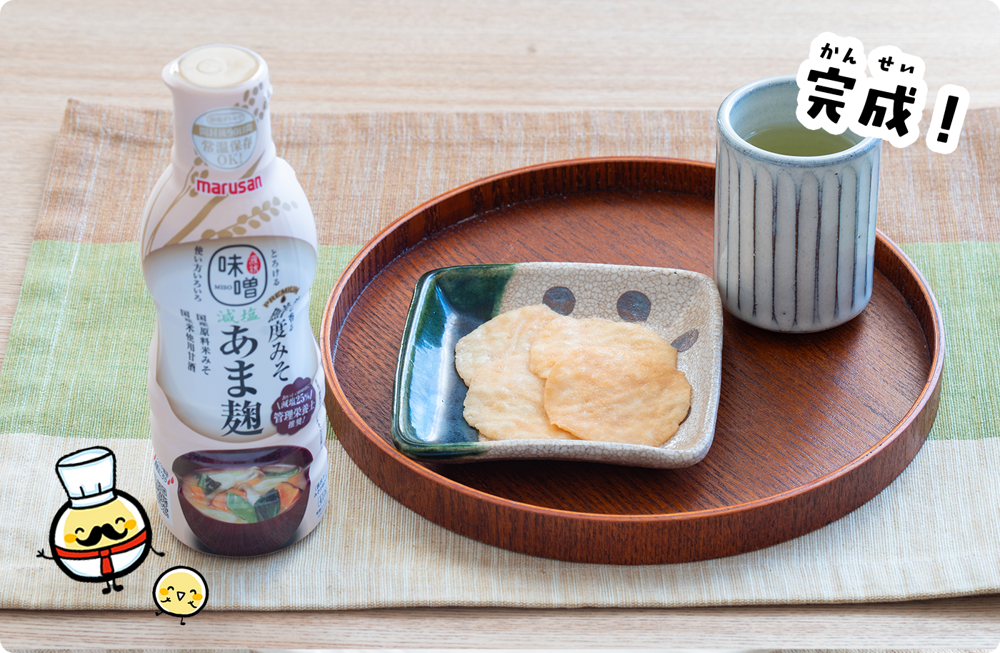 取 り出 し、おせんべいについているみそを水 で洗 い流 し、キッチンペーパーで水 気 をふき取 ったら、できあがり!