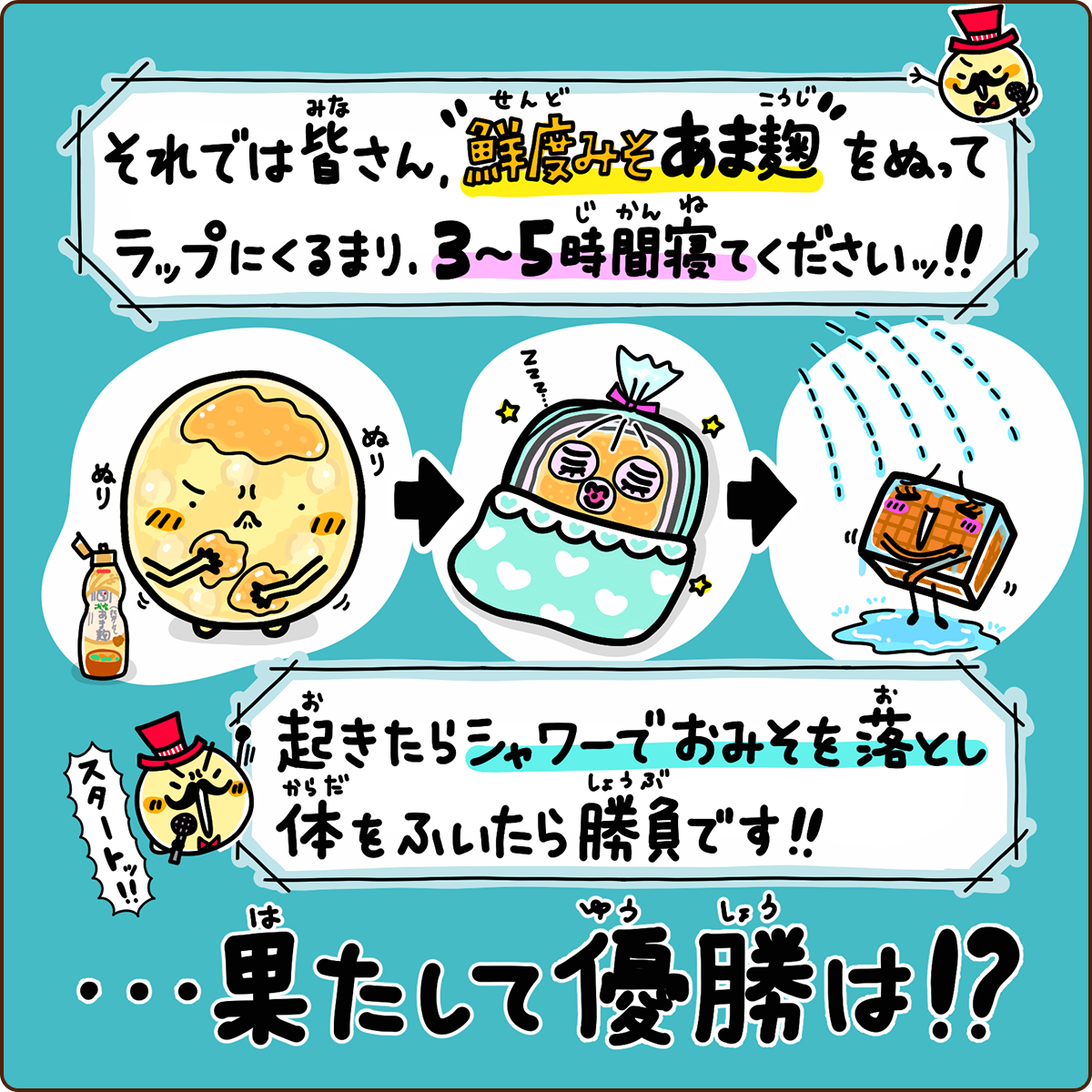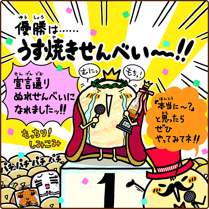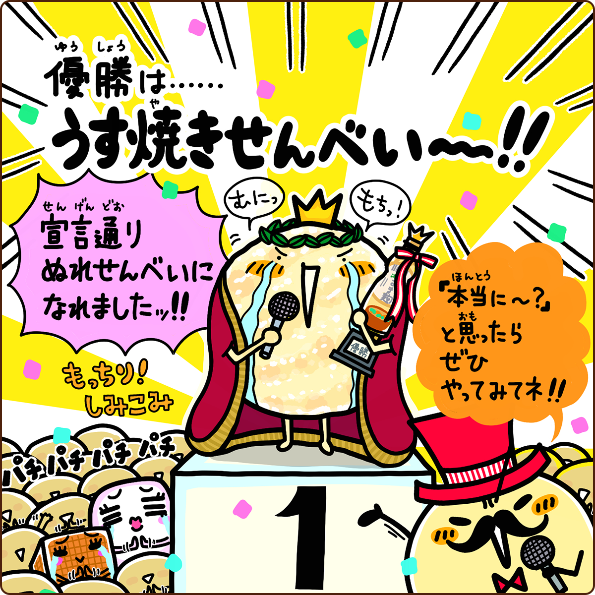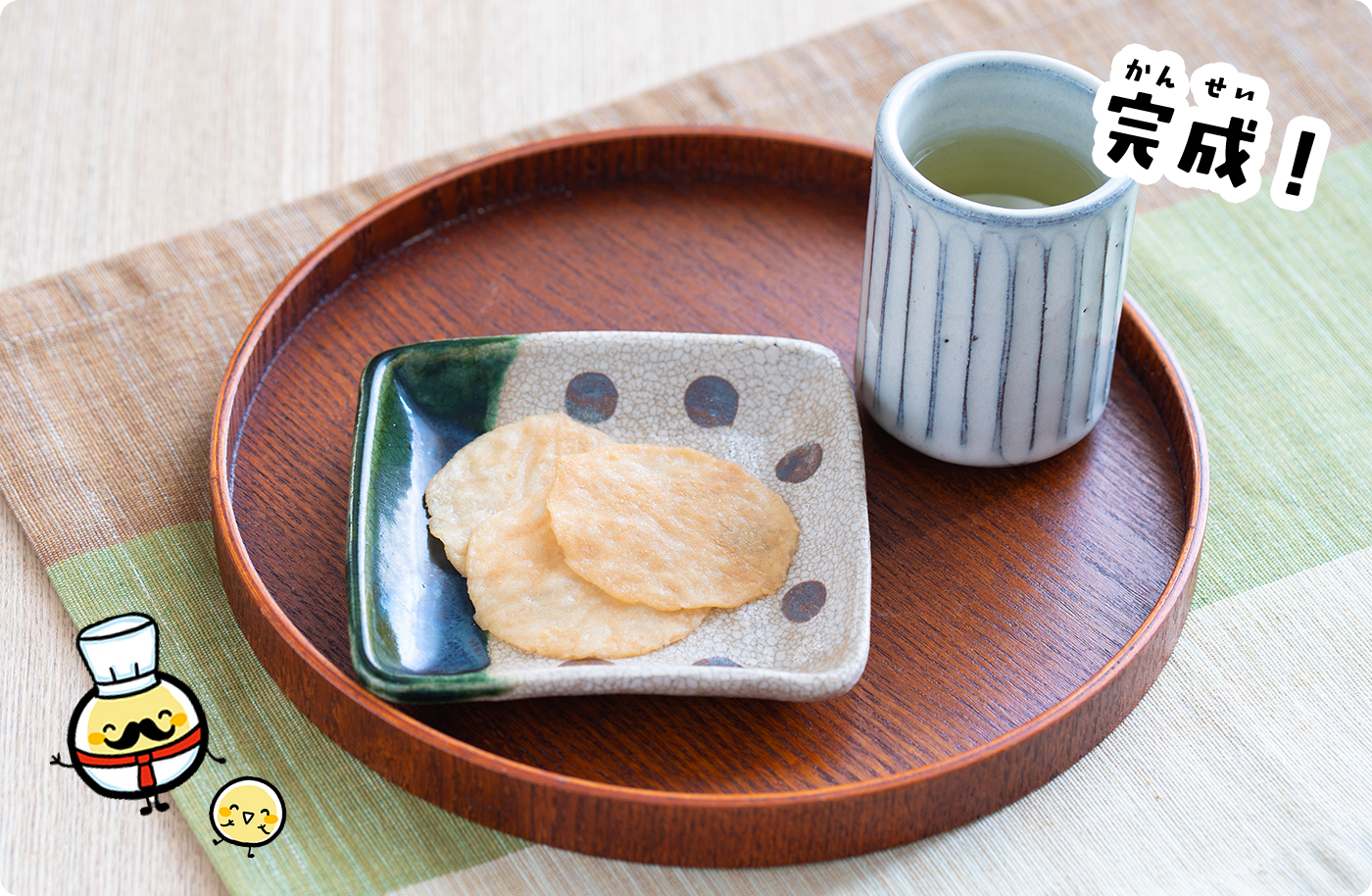 取 り出 し、おせんべいについているみそを水 で洗 い流 し、キッチンペーパーで水 気 をふき取 ったら、できあがり!