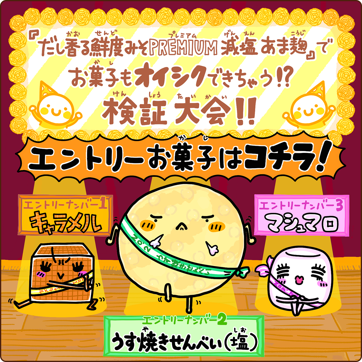 付 き保 存 袋 に、おせんべいと「鮮 度 みそ減 塩 あま麹 」を入 れる。