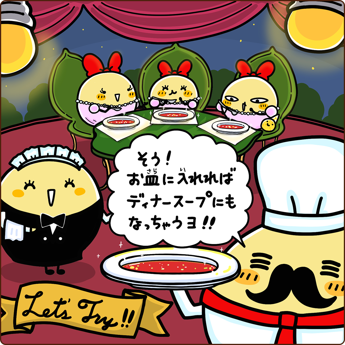 皿 によそうと、おしゃれなディナーの冷 製 スープとして楽 しめるよ♪