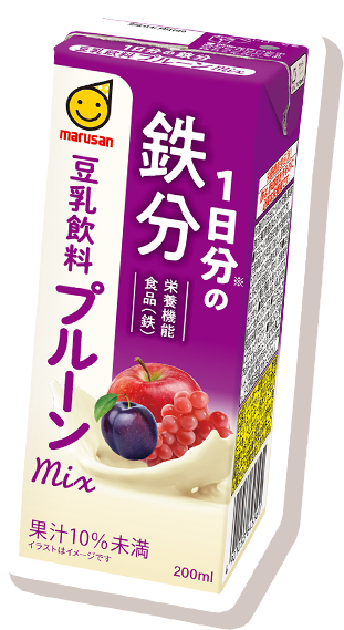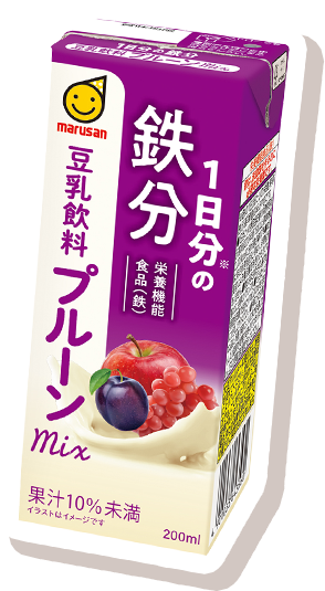 「1日分の鉄分 豆乳飲料 プルーンmix 200mlは1日分※の鉄分を手軽に取れる栄養機能食品の豆乳飲料だよ。