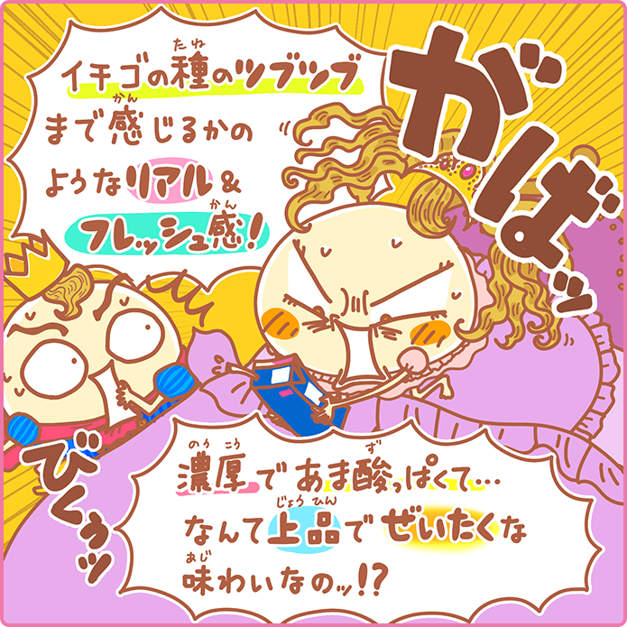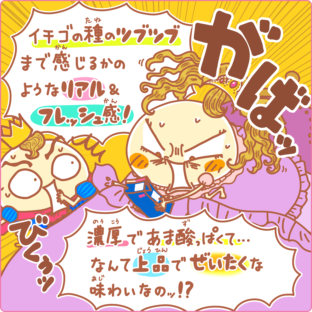 何と言っても、「あまおう」の甘酸っぱくジューシーな味わいと、ひとつ上の豆乳の濃厚さがマッチして、とってもオイシイ!これはみんな笑顔になっちゃうね。