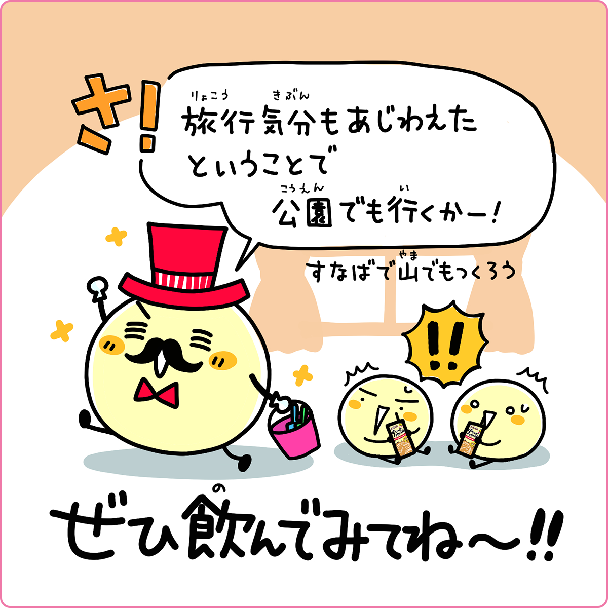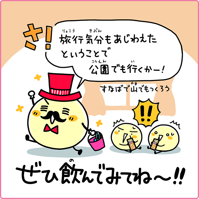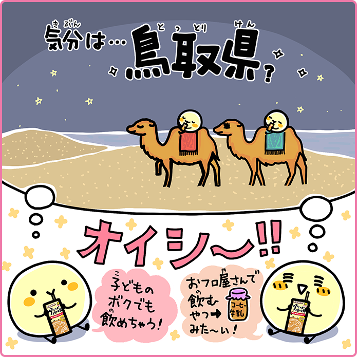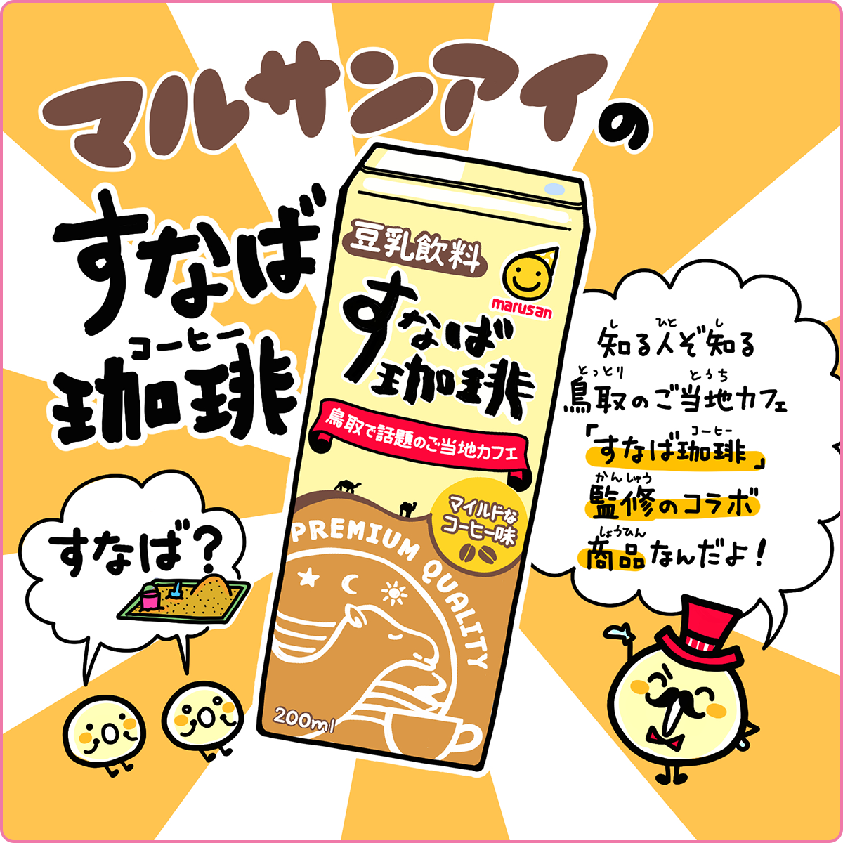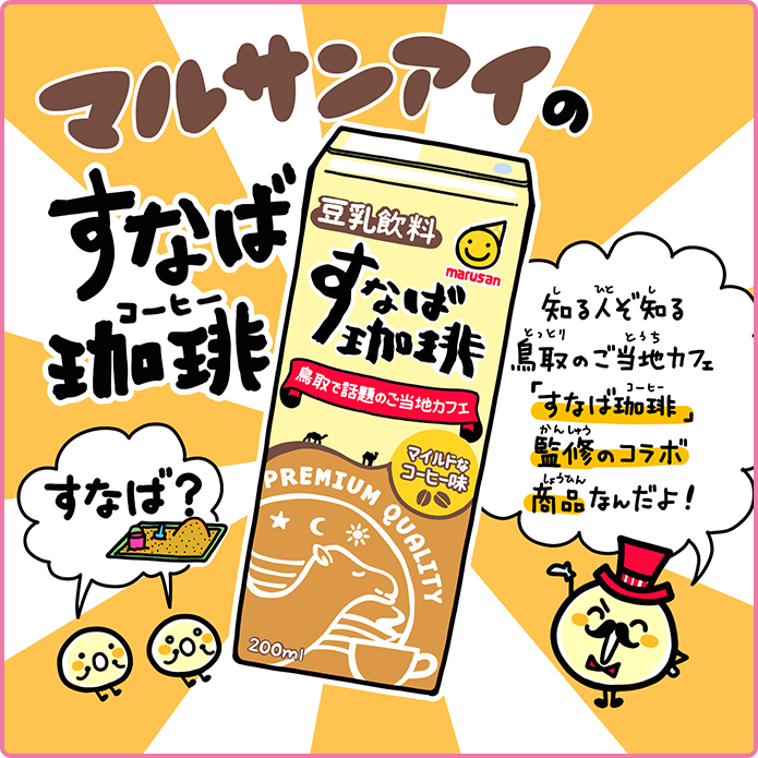 飲のむと鳥とっ取とり県けんに行いった気き分ぶんになれるかも!? 話わ題だいのご当とう地ちカフェ「すなば珈琲こーひー」のコーヒー原げん料りょうを使つかったマイルドな味あじわいの豆とう乳にゅう飲いん料りょうだよ。 コーヒー牛ぎゅう乳にゅうのようなまろやかな甘あまさで、とっても飲のみやすいよ。