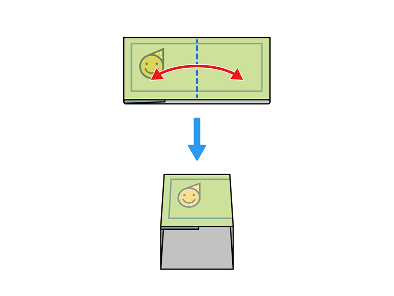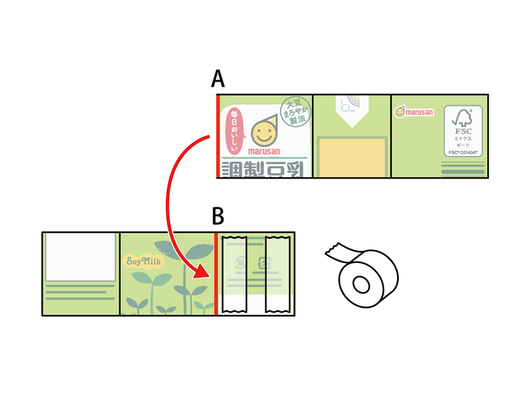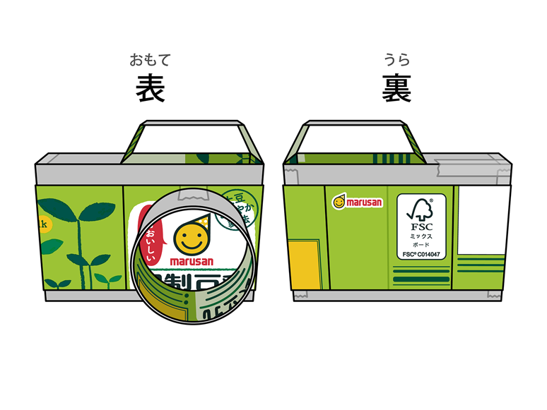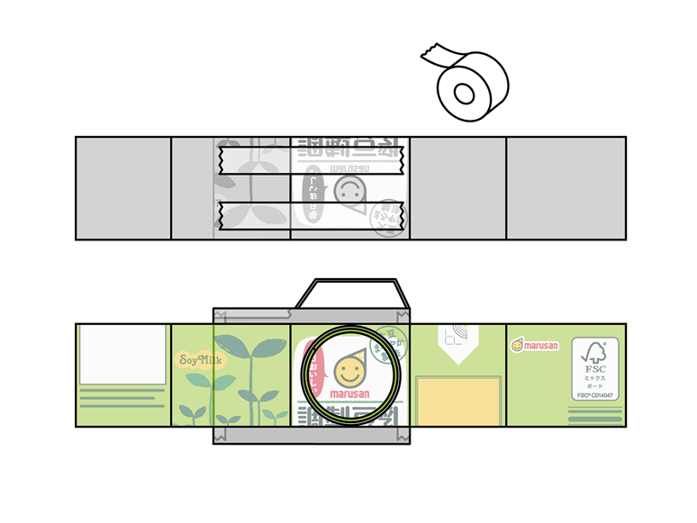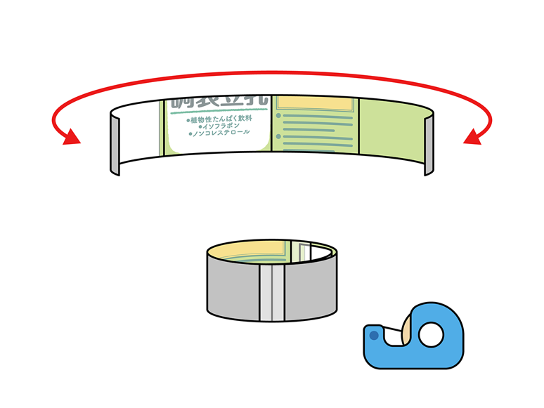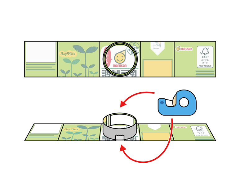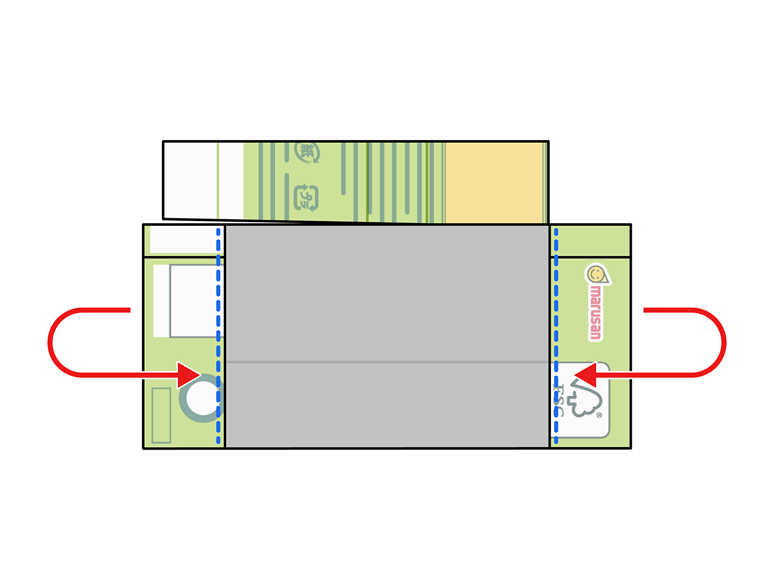 はみ出 した部 分 (のりしろになる)を谷 折 りし、柄 の面 に両 面 テープを付 けて内 側 (マルサン坊 やの裏 側 )に重 ねて貼 る。
