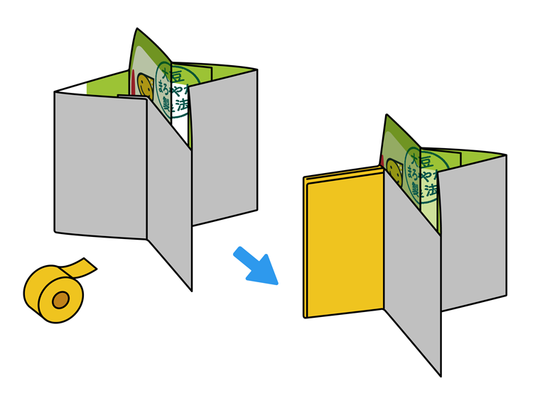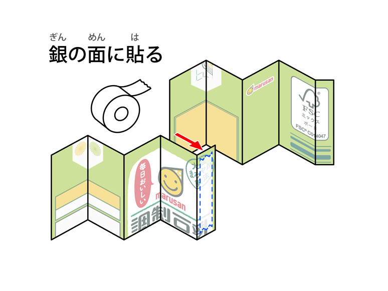 もう片 方 も同 様 に、のりしろ部 分 (銀 の面 )に両 面 テープを付 け貼 り合 わせる。