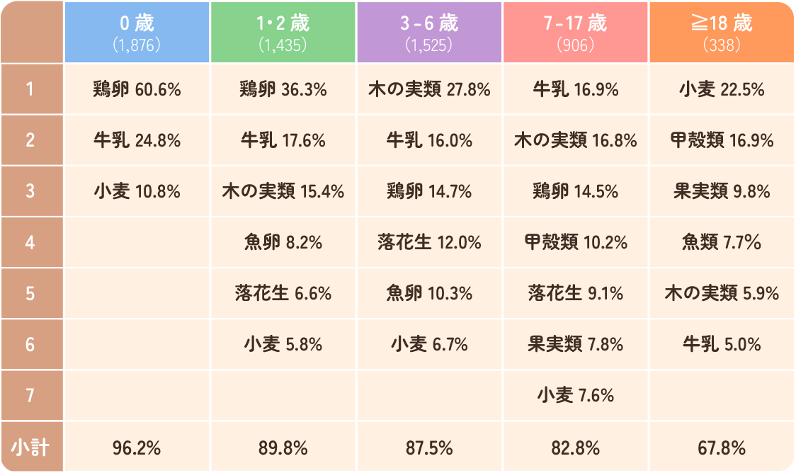 ※各年齢群で5%以上の頻度の原因食物を示した。また、小計は各年齢群で表記されている原因食物の頻度の集計である。原因食物の頻度(%)は小数第2位を四捨五入したものであるため、その和は小計と差異を生じる。