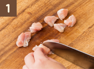 鶏もも肉は1cm角に、かまぼこは半分に、しいたけは十字に4等分に切る。
