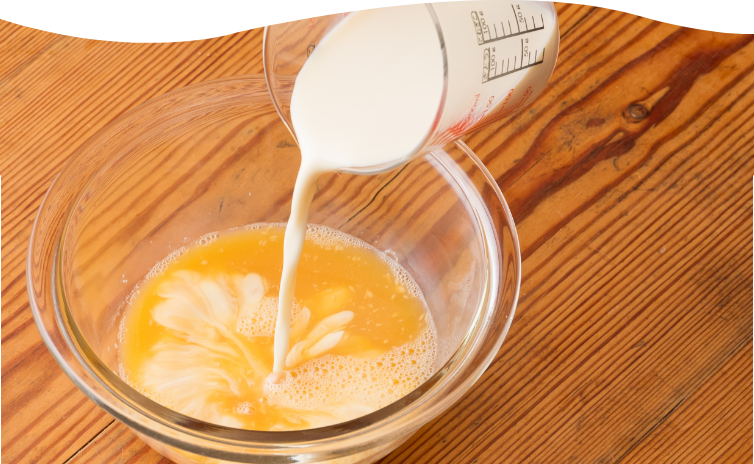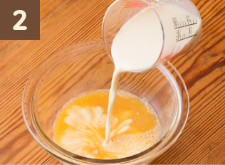 ボウルに卵を溶きほぐし、🅰︎の調味料、水、豆乳を加えて混ぜ合わせる。