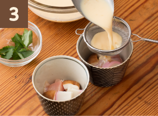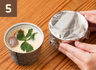 器に具材を入れ、茶こしでこしながら2を注ぐ。みつ葉をのせアルミホイルを被せる。
