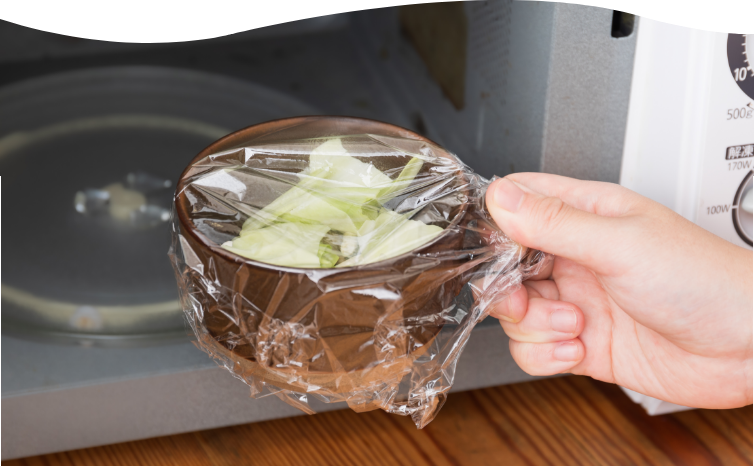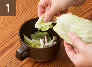 カップにちぎったキャベツ、しめじを入れ、ラップをかけて加熱する。(600Wで1分半)