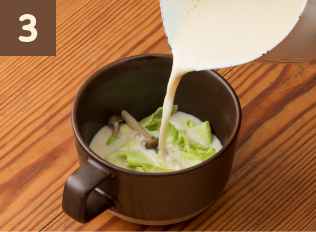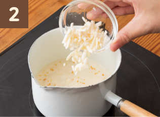 鍋に豆乳、コンソメ、豆乳シュレッド(またはチーズ)を入れ沸騰直前まで温める。