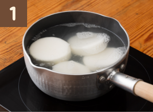 大根は2cm幅に切って皮をむき、隠し包丁、面取りをして米のとぎ汁(分量外)で下ゆでする。