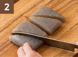 こんにゃくは表面に格子状の切り込みを入れて三角に切り熱湯でゆで、粗熱をとる。