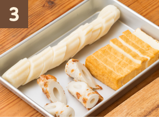 ちくわぶは1.5cm幅の斜めに、焼きちくわは4等分に、厚揚げは1cm幅に切る。