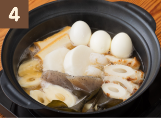 ゆで卵を加えて冷ます。白く固まった脂は取り除き、再度弱火で温め器に盛る。