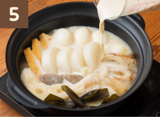 煮汁で酒粕を溶き豆乳を混ぜる。鍋に入れ、沸騰しないよう気をつけながら弱火で10分煮込んで完成。