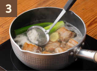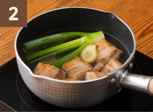 鍋に1、長ねぎ、しょうが、かぶるくらいの水(分量外)を入れて加熱する。