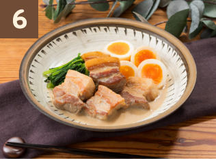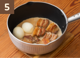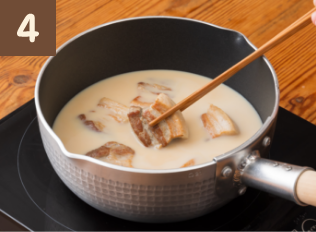 鍋に豚肉、煮汁の材料を入れ加熱。ひと煮立ちしたら落とし蓋をし弱火で30分煮込む。