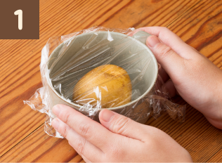 洗って芽を取った皮付きのじゃがいもをカップに入れ、ラップをかけてレンジ加熱する。(600Wで3分)