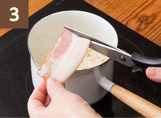 キッチンバサミで切ったベーコン、豆乳、コンソメ、塩を鍋に入れ沸騰直前まで温める。