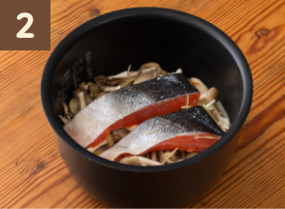 生鮭としょうが、しめじ、まいたけ、にんじんをのせて普通炊きで炊飯する。