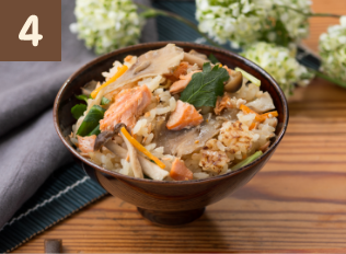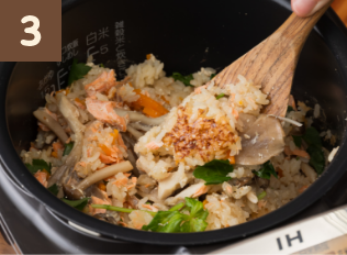 炊き上がったら鮭の皮と骨を取り除く。1cm幅に切ったみつ葉を加える。