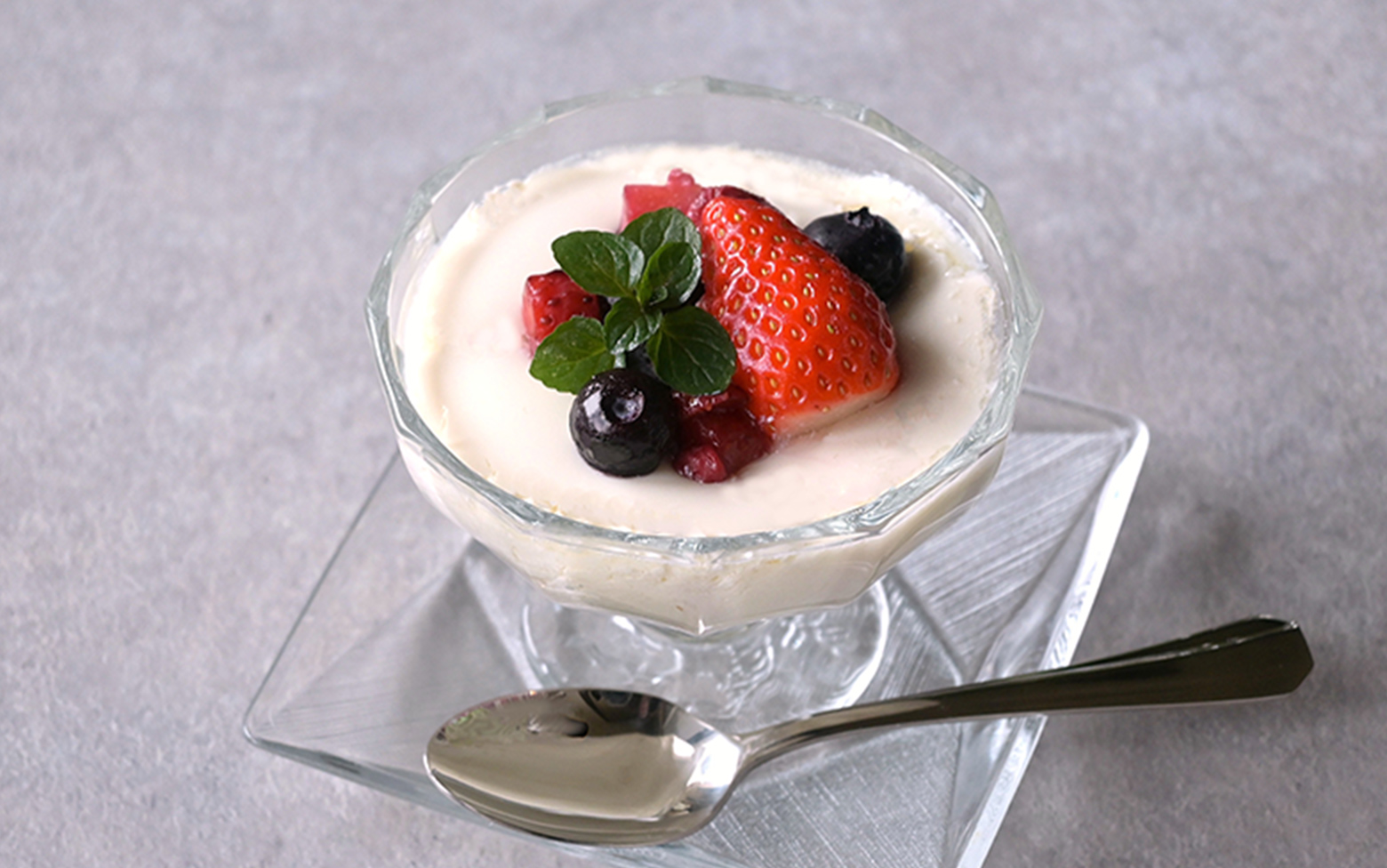 3を冷蔵庫で冷やし、スプーンで適量(150g)取り出し、好みの果物と一緒に盛り付ける。