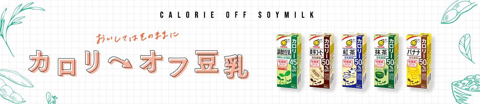 調製豆乳を飲みたいけどカロリーが気になる…という方におすすめしたいのが、「カロリーオフ豆乳」です。もともとノンコレステロールの豆乳から、さらにカロリーと糖質を抑えた低糖質(※)の商品です。カロリーや糖質を気にせずおいしく味わえて、大豆たんぱく質や大豆イソフラボンなど豆乳の栄養素も摂取できます。麦芽コーヒーやバナナといった味のついた豆乳飲料もラインナップ。ヘルシーなおやつとしてもおすすめです。