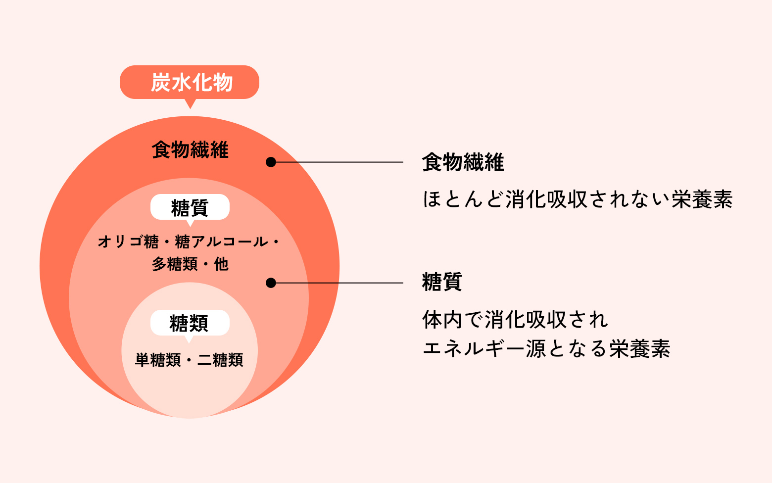 また、三大栄養素のたんぱく質・脂質・炭水化物のうち、炭水化物量から食物繊維量を差し引いたものを「糖質」と呼びます。「糖質」はご飯、パン、麺、芋などに豊富に含まれており、筋肉や脳のエネルギー源として使われる大切な栄養素です。しかし、多く摂りすぎると中性脂肪に変わってしまうため、注意が必要です。