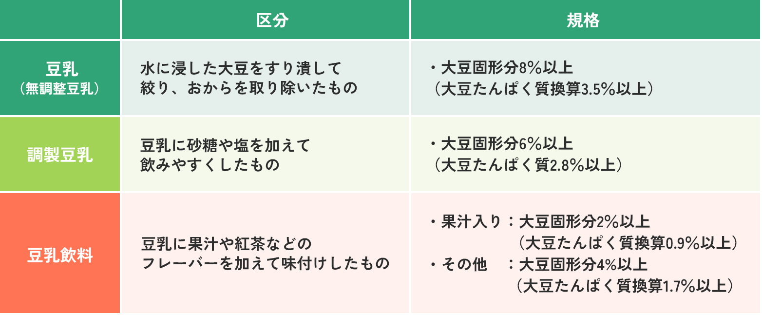 一般的に流通している豆乳商品は、大きく分けて、豆乳(無調整豆乳)、調製豆乳、豆乳飲料の3種類があり、日本農林規格(JAS)によって下記のように定義されています。