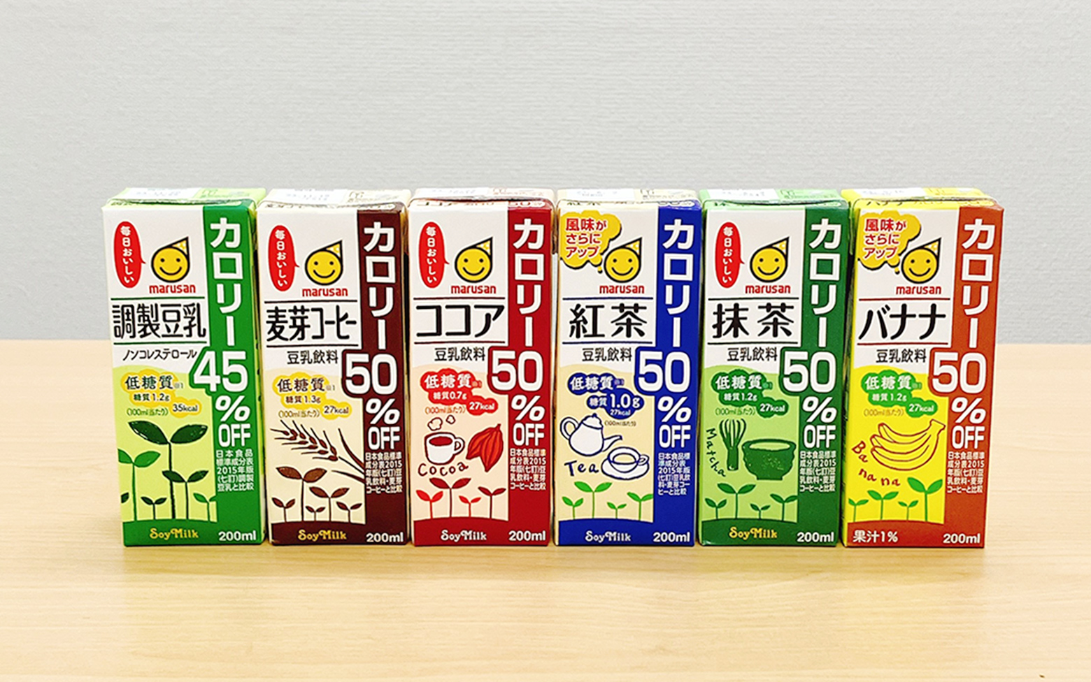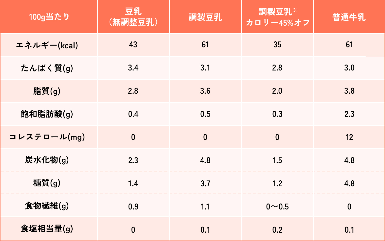 ※カロリーオフ豆乳「調製豆乳 カロリー45%オフ」の栄養価はマルサンアイ商品の分析値。標準的な調製豆乳(日本食品標準成分表2015年版(七訂))に比べ、カロリーを45%抑えています。