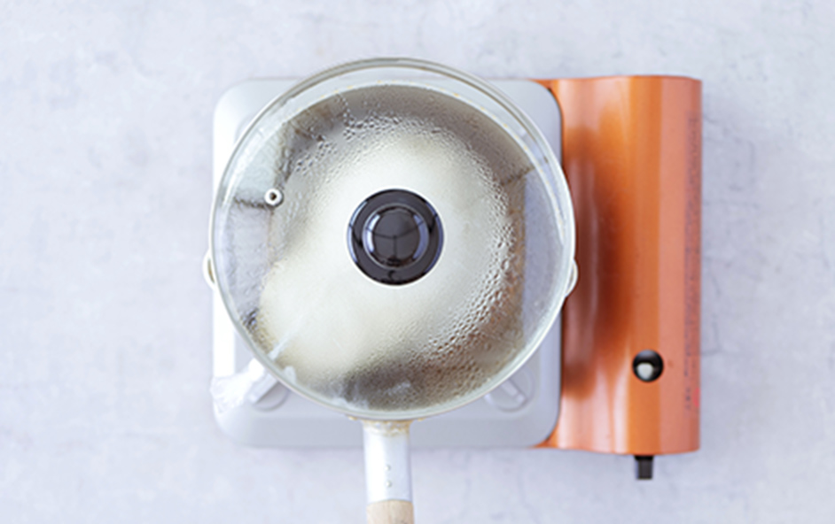鍋の1/2程度まで水(分量外)を入れ、一回り小さい皿を敷いたら、中火にかける。