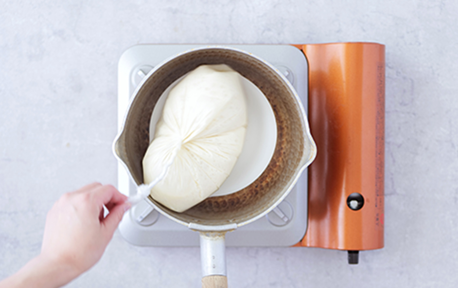 1が沸騰したら、弱火に落とし、2を皿の上にのせる。蓋をして弱火で30分加熱し、火を止めたらそのまま冷ましておく。