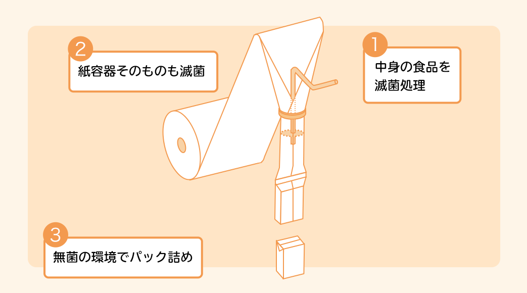滅菌した液体を滅菌した包装材で無菌の環境下でパック詰めするので、食品の変質の原因となる微生物が容器の中に存在しません。