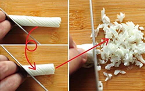 長ねぎは切り落とさないよう注意しながら端から斜めに切り込みを入れます。切り込みを入れた側が下になるようひっくり返し、同じように反対の面にも斜めに切り込みを入れます。表裏両面に切り込みを入れ終わったら、端から2~3mm幅で切っていくとみじん切りになります。