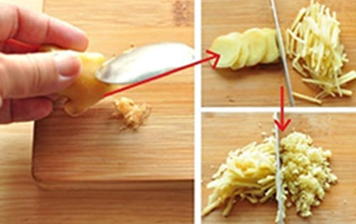 しょうがはスプーンで皮をこそげ落とし、薄切りにします。少しずつずらしながら並べて端から千切りにし、向きを変えてみじん切りにします。