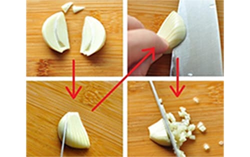 にんにくは縦半分に切って芯を取り除きます。切った面を下にして根元部分を残すように縦1~2mm幅の切り込みを入れます。次に包丁を横に寝かせて2~3か所に切り込みを入れたら端から細かく切ってみじん切りにします。残りのにんにくも同様にみじん切りにします。