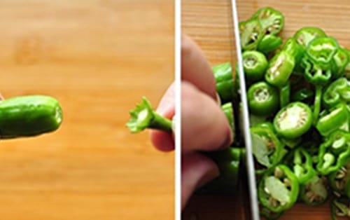 ししとうがらしはヘタを手で引っ張ってはずし、2~3本を束ねて端から小口切りにします。