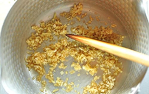 鍋にごま油をひき、しょうがとにんにくを中火で炒めます。