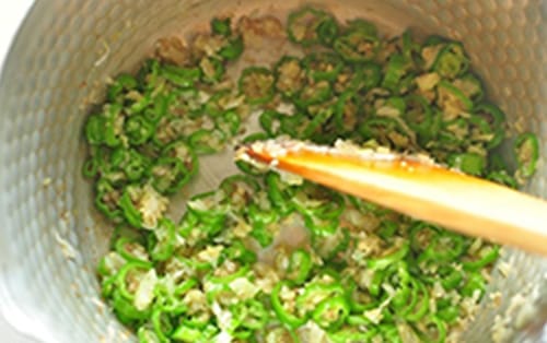しょうがとにんにくのよい香りが立ったら、長ねぎとししとうがらしを加えて炒めます。