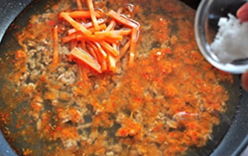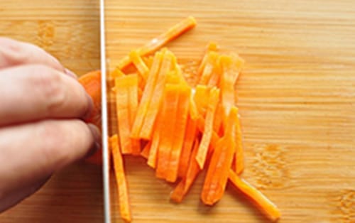 にんじんは、もやしの太さと同じくらいになるよう、2mm角の細切りにします。